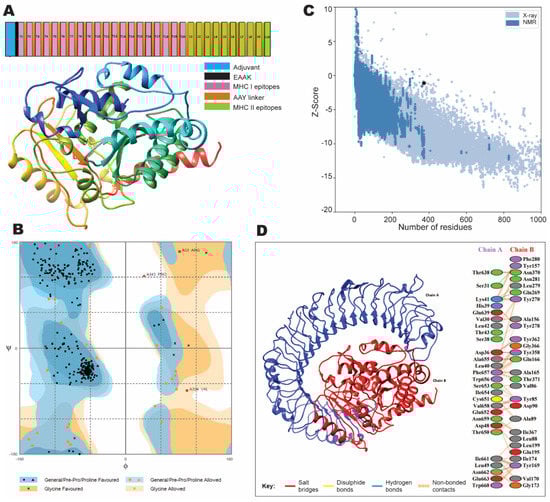(A) A schematic illustration of the vaccine construct showing epitopes with linkers and adjuvant (β-defensin). The predicted tertiary structure (3D) of the vaccine construct by homology modeling on I-TASSER. (B) Validation of the refined tertiary structure with Ramachandran plot analysis showing 92.7% region in favored region, 6.5% in allowed regions, and 0.8% in outlier regions. (C) The tertiary structure validation by ProSA-web showing a Z-score of −1.5. (D) Molecular docking of the vaccine construct with the immune receptor TLR3. Red color indicates the vaccine construct (chain B) while the blue color indicates TLR3 (chain A). Molecular interactions are shown between chain A and B.