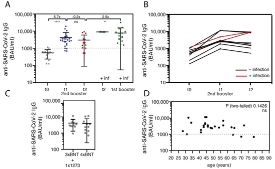 Characterization of the anti-Spike IgG antibody response after the second booster vaccination or after SARS-CoV-2 infection after booster vaccinations. (A) Anti-SARS-CoV-2 IgG levels were determined and indicated as binding antibody units per milliliter (BAU/mL) in samples before the second booster (t0), 2 weeks (t1), 7.3 weeks (t2), or infection after the first or second booster (unpaired, non-parametric, Mann–Whitney, t0 vs. t1 p < 0.0001 (indicated as ****); t1 vs. t2 ns, t2 vs. 1st booster + infection p < 0.0063 (indicated as **); error bars mean+/−SD), ns = non-significant. (B) Individual responses of 8 individuals after the second booster vaccination and 2 after the second booster followed by a SARS-CoV-2 infection are plotted. (C) Anti-SARS-CoV-2 IgG levels dissected between the most common immunization schemes in Germany in 2021 (3× BNT162b2 and 1X mRNA-1273 and 4x BNT162b2) (unpaired, non-parametric, Mann–Whitney, ns—not significant, error bars mean+/−SD). (D) The correlation between age and IgG levels does not show any significance (linear regression—not significant). Abbreviations: BNT = BNT162b2; 1273 = mRNA-1273.