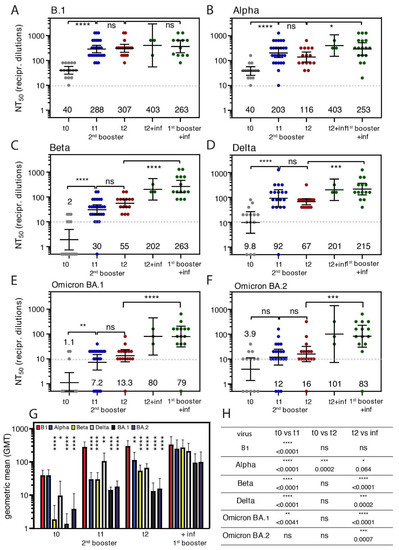 Characterization of neutralization titers after the second booster or infection against different VOCs. Neutralization assays were conducted using the authentic SARS-CoV-2 strains B.1 (A), Alpha (B), Beta (C), Delta (D), and Omicron BA.1 (E) and Omicron BA.2 (F) using sera from recipients after the second booster vaccinations at t0 (N = 15), t1 (N = 26) and t2 (N = 15). The analysis also included sera from individuals after breakthrough infections after the second booster (N = 3) and first booster (N = 17) (unpaired, non-parametric, Mann–Whitney, error bars = geometric mean with 95% CI). Statistics are summarized in (H). (G) Graph depicting the geometric means of tested groups as indicated by the color code (unpaired, non-parametric, Mann–Whitney). (H) Summary of the statistical analysis of A–F (unpaired, non-parametric, Mann–Whitney). Asterisks indicate significance: **** p < 0.0001; *** p < 0.001; ** p < 0.01; * p > 0.01, ns = non-significance.