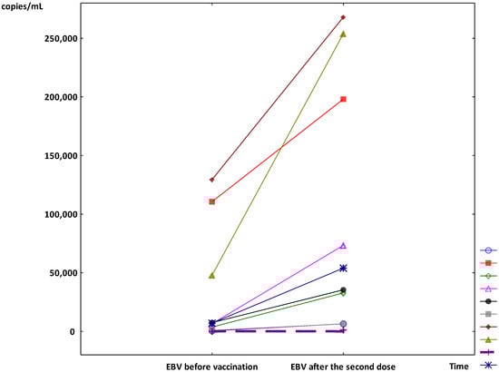 In the other 9 patients, after the second dose of vaccine, a significant increase in median viremia was observed (7062 copies/mL (IQR 2321–79,285) vs. 54,451 copies/mL (IQR 19,655–225,990); p < 0.01) (Figure 1). The individual results of the EBV viremia changes are presented in Figure 2. During the six-month post-vaccination observation period, the kidney and liver graft functions were stable in all patients, as were the levels of immunosuppressive drugs. The median viremia of 20,200 copies/mL (IQR 565–34,070) was observed 6 months after the second dose (p < 0.05 vs. the results at first month post-vaccination and without significance vs. the initial results).