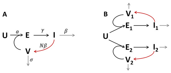 Schemes depicting the transitions of cells between different infected states (black arrows), virus production (red arrows), and death of cells and virus (gray arrows). U—uninfected cells; E—“exposed” cells (infected but still not shedding the virus); I—infected cells shedding the virus; V—free virus particles. (A) One-strain model. (B) Two-strain model with competition of strains for the uninfected cells.