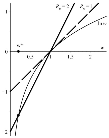 Graphical solution to Equation (8a) for two values. Thin line—, bold lines—.