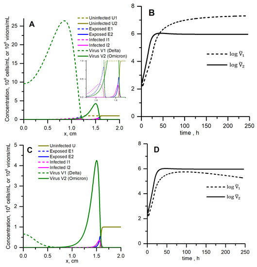 Solution to Equation (3) describing the competition of two virus strains is presented in Figure 5C. Equations for two strains are coupled now through the concentration of uninfected cells (the model suggests that the a cell cannot be co-infected by both strains). The calculation was stopped when the Omicron wave had travelled the same distance as in the no-competition situation (which is shown in Figure 5A). Compared to that case, the concentration of the Omicron strain is the same (solid line, note the difference in the y-scale), but the Delta strain is completely suppressed (dashed line). The steady speed of Omicron strain wave propagation is the same as in the no-competition situation, cm/h. The spatially integrated concentration of the Delta strain is lower than for the Omicron strain during the whole time period (Figure 5D).