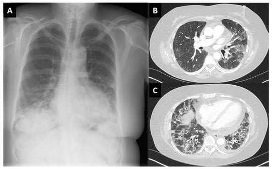 Chest X-ray (A) and high-resolution computed tomography scan (B,C) of case 3 (female, 58 years old) with findings compatible with interstitial lung disease. Lung biopsy not performed.