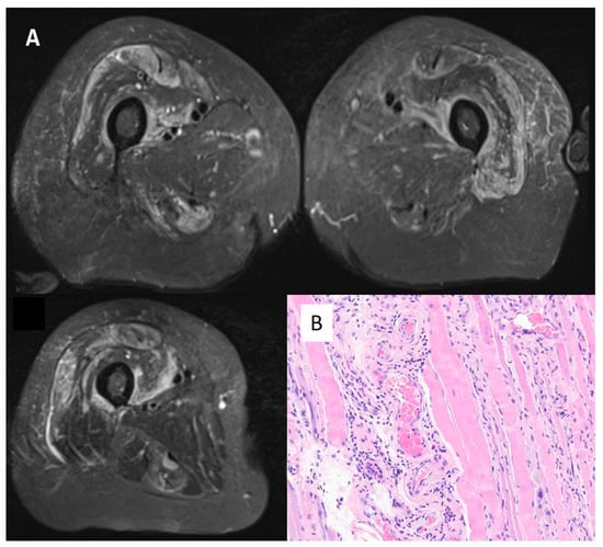 Panel (A)—MRI scan of thighs from Case 1 (female, 68 years old). Oedema in the quadriceps (vastus intermedium femuri; vasti medialis and rectum femuri) bilaterally, pointing to inflammation in the muscle masses explored. Panel (B)—Muscle biopsy from case 10 (female, 71 years old). Haematoxylin/Eosin, magnification 400×. Perimyseal pathology with local thrombosis consistent with a vasculopathy and macrophages present consistent with immune-mediated necrotising myositis. Anti 3-hydroxy-3-methylglutaryl-coenzyme A reductase antibodies were positive.