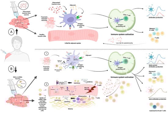 Panel (A): Conventional vaccines involve the delivery of a killed pathogen, attenuated pathogen or a protein subunit with adjuvants—including alum and others—to the inoculation site. This is associated with local muscle and endothelial and supporting tissue injury at the site of vaccination. It is thought that uptake of both the antigens and adjuvants by the antigen presenting cells leads to activation of such cells and migration to the regional lymph nodes where lymphocyte priming takes place and robust antibody responses to antigen takes place. In theory, vaccine-associated injury from the injecting needle might release self-antigens that are also taken up by the Antigen-Presenting Cells (APCs) and could theoretically lead to tolerance failure and autoimmunity. However, this is not something that is recognised in the clinical setting with conventional vaccines; hence, it seems unlikely to occur. Panel (B): Like Conventional vaccines, the novel DNA- and RNA-based vaccines are also taken up by antigen-presenting cells and migrate to regional lymph nodes and likewise damaged self-muscle, endothelial and stromal tissue elements from sites of injury could undergo pinocytosis and likewise be transported. Copying elements of the viral life cycle within APCs facilitates CD4 and cytotoxic CD8 T-cell responses, that are superior to conventional vaccines and could thus contribute also to the development of better cell-mediated immune responses [28,29]. There is actually a very limited amount of data about the uptake and processing of nucleic acid vaccines following intramuscular injection; however, direct uptake of RNA and DNA into the muscle has been reported [26,30,31]. Further experimental studies and epidemiological surveys are needed to test this hypothesis. Image created with BioRender.com.