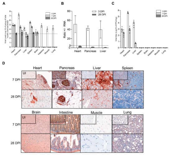 First, we identified target tissues in which an intraperitoneal CVB3/28 infection induced an acute followed by a persistent infection, in DBA/2J mice (Figure 1). DBA/2J mice were chosen for our experiment since CVB3/28 persistence has been reported, and it is a known immunocompetent model for cardiovascular research []. During the course of acute CVB3/28 infection (3–7 days post infection, DPI) and at the chronic stage (28 DPI) of viral infection, viral total RNA levels, +/− RNA ratios, viral titers, and VP1 expression were assessed in a large panel of viral target tissues. Total RNA viral loads, VP1 expression, and infectious particle production were maintained at 7 DPI only in the heart, pancreas, and liver, demonstrating an acute infection phase (Figure 1A–D). In other organs, only low levels of viral RNA were observed until 7 DPI, followed by a total clearance of viral markers at 28 DPI (Figure 1A–D). At 28 DPI, low viral RNA levels, +/− RNA ratios < 5 associated with VP1 expression revealed a persistent infection in the heart, pancreas, and liver (Figure 1A–D). Finally, an acute followed by a persistent CVB3/28 infection was observed only in the heart, pancreas, and liver. By contrast, only low levels of viral genomic replication activities were observed in the brain, intestine, muscle, and lung (Figure 1A–D).