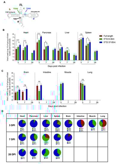 Emergence and maintenance of 5′TD EV-B populations in organs of CVB3/28-infected mice. (A) Schematic representation of EV-B cloverleaf secondary structures with stem “a” and stem-loops “b”, “c”, and “d”. Schematic representations of deletions of 8, 36, and 50 nucleotides and its impact on cloverleaf secondary structures, loss of stem “a”, stem “a” plus stem-loop “b”, and loss of stem “a” and stem-loops “b-c”, respectively. (B,C) EV-B FL and 5′TD respective viral loads were measured using a RACE-PCR method associated with a micro-electrophoresis (Agilent®) in organs of CVB3/28-infected mice (n = 8 to 10 in B; n = 3 to 6 in) (C). Data represents mean + SEM (Mann–Whitney U test; *: p < 0.05; **: p < 0.01; ***: p < 0.001, ns: non-significant). (D) Schematic representation of full-length and 5′TD populations percentages. Data represents mean. TD: terminally deleted.