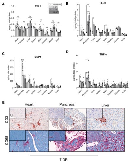 Inflammatory response in organs of CVB3/28-infected DBA/2J mice. (A–D) IFN-β, IL-10, TNF-α, and MCP1 levels were measured by ELISA in homogenized organs supernatants of CVB3/28-infected DBA/2J mice and compared to cytokines levels in homogenized organs supernatants of uninfected DBA/2J mice (n = 4 to 5). Data represent mean +/− SEM (Mann–Whitney U test; *: p < 0.05; **: p < 0.01; ***: p < 0.001; ****: p < 0.0001; ns or not specified: non-significant). (E) Positive CD3 and CD68 cells were found in inflammatory foci or infiltrates at 7 DPI only in the heart, pancreas, and liver. They were absent in other organs and in uninfected mice. Original magnification: heart, 200×; pancreas and liver, 400×. DPI: Days Post Infection. UI: Uninfected.