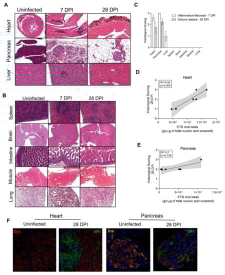 Histological lesion scorings were positively correlated with 5′TD viral loads in the heart and the pancreas at 28 DPI (R2 = 0.89, p = 0.009 and R2 = 0.7, p = 0.038, respectively; Figure 4D,E). In the heart, at 28 DPI, VP1 was detected in cardiomyocytes by immunofluorescence staining, with colocalization of VP1 expression and dystrophin disruption (Figure 4F). In Langerhans beta cells of the pancreas, VP1 was detected with a decrease in insulin staining or insulin content (Figure 4F). These results indicated that a CVB3/28 persistent infection in target cells—cardiomyocytes and beta cells—associated with chronic histological lesions induced cellular dysfunctions related to pathological processes such as dystrophin cleavage or insulin metabolism impairment.