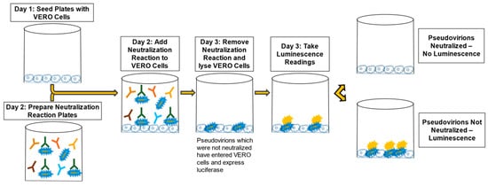 The first PsVNA development experiments used positive immune serum and naïve serum to show that the assay was able to measure neutralization of the pseudovirion (PsV) in positive serum and not detect neutralization in naïve serum. Once the basic performance of the PsVNA procedure was verified using positive and naïve serum samples, additional aspects of the assay were evaluated, including VERO E6 cell seeding densities, luciferase reagent volumes, and the impact of mild shaking during the neutralization reaction. These experiments established a seeding density of 60,000 cells per well one day prior to conducting the PsVNA, a luciferase reagent volume of 60 µL per well, and no shaking during the neutralization reaction. This established the general assay procedure used for all PsVNAs, regardless of the PsV or serum species used (