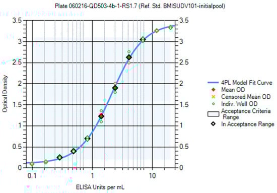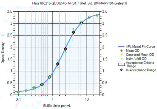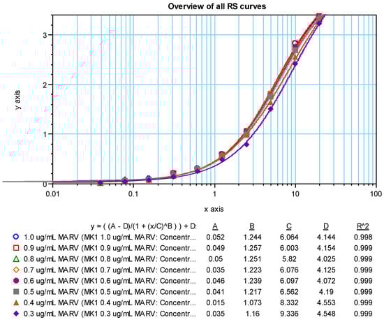 The first-generation MARV RS (Lot Number BMIMARV101) was a pool of sera from two convalescent MARV infection survivors received from the USAMRIID that was diluted with pooled naïve human serum. Starting dilutions of 1:50 and 1:100 and serial dilutions of 1:2, 1:1.9, 1:1.8, 1:1.7, 1:1.6, and 1:1.5 were evaluated, and the resulting OD values were used to generate RS curves from a 4PL model. The RS was assigned an arbitrary concentration of 1000 ELISA units/mL.