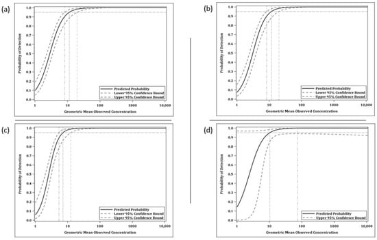 The LOD is the lowest antibody concentration for which there is at least 95% probability that an estimate can be obtained. From the logistic curve comparing the probability of detection against the geometric mean observed values for all test samples, the LOD for the anti-MARV GP IgG ELISA was estimated to be 11.42 ELISA units/mL (human) and 11.67 ELISA units/mL (NHP) (