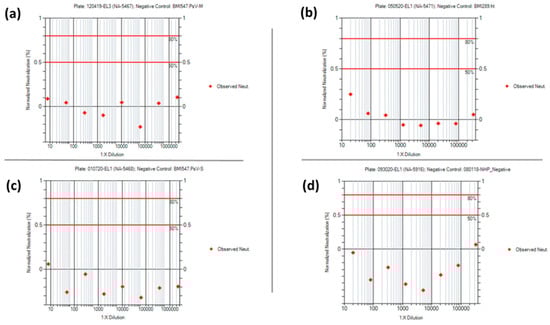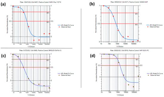 Supplemental Tables S24–S27). None of the negative controls used in the four PsVNAs had a 50% or 80% neutralization titer, as expected. Representative neuralization data for each of the negative controls are shown in