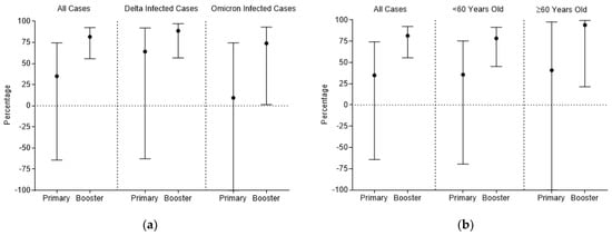 Protective effect of complete primary and booster of inactivated COVID-19 vaccines compared with the unvaccinated or partially vaccinated. (a) Protective effect against progression to pneumonia stratified by genotype; (b) protective effect against progression to pneumonia stratified by age.