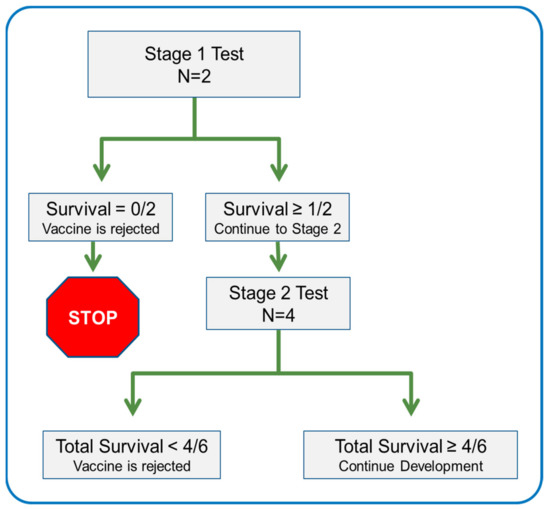 The optimal design was implemented as follows: Two NHPs were tested in Stage 1. If neither survived a normally lethal challenge, testing stopped for that candidate. If one or more NHPs survived, an additional four NHPs were tested in Stage 2. At most six NHPs were tested in two stages. A candidate vaccine could be rejected after either stage. A candidate vaccine was accepted for further investment/advancement if four or more NHPs were protected over both stages (Figure 1).