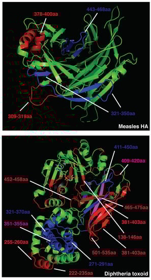 Crystal structure of measles hemagglutinin (PDB:2ZB6, top) or diphtheria toxoid (PDB:1MDT, bottom). Immunodominant B cell epitopes are depicted in red, while dominant CD4 determinants are highlighted in blue. Overlapping epitopes are highlighted in pink.