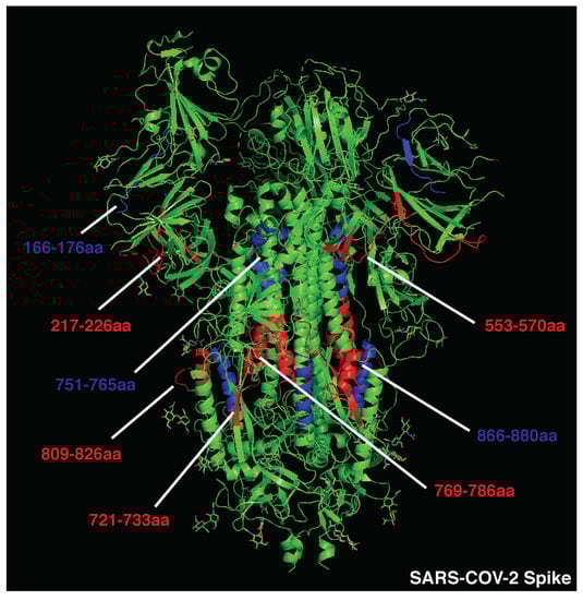 Crystal structure of SARS-CoV-2 spike protein (PDB:6VSB). Immunodominant B cell epitopes are depicted in red, while dominant CD4 determinants are highlighted in blue.