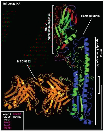 Crystal structure of influenza hemagglutinin and MEDI8852 bnAb (PDB:5JW3). Immunodominant B-cell epitopes are depicted in red, while dominant CD4 determinants are highlighted in blue. Amino acids essential for MEDI8852 binding are listed (bottom left) and those overlapping with CD4-dominant regions are highlighted in red.