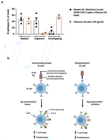 (a) Quantification of dominant B cell epitopes classified as distant from (>15aa), adjacent to (<15aa), or overlapping with (<0aa) immunodominant CD4 determinants within the same antigen. Good nAb inducers (measles HA, diphtheria toxoid, SARS-CoV-2 spike, and influenza HA head: black dots) and poor nAb inducers (influenza HA stem and HIV gp120: red dots) are compared. Chi-squared analysis was applied (see Table S7). (b) Model figure showing immunodominant B cell (left) recognizing immunogenic viral regions and boosting antigen presentation upon BCR binding; right, subdominant B-cell clone binding conserved/poorly immunogenic viral regions and inhibiting presentation of overlapping CD4 epitopes.