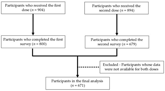 The sample selection process is shown in the flowchart (Figure 1). Overall, 904 and 894 staff received a first and second dose of the vaccine, respectively (88.50% vaccination coverage); and 800 and 679 completed the first-dose and second-dose questionnaires, respectively (response rate: 75.95%). A total of 671 participants whose data on both vaccine doses were available were included in the analysis.