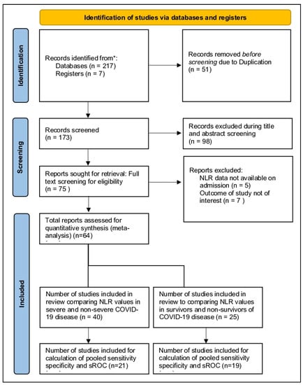 A total of 225 citations were identified from various peer-reviewed databases from 1 January 2020 to 1 May 2021. After study screening and eligibility selection, we found 64 studies consisting of 15,683, which met all our criteria. They were further divided into 40 studies that compared NLR values in severe and non-severe disease and 25 articles that compared NLR in the deceased and survivors. Twenty-five articles conducted an ROC analysis for the prognostic value of NLR to predict severe disease and nineteen articles to predict mortality outcomes (Figure 1). Most studies were retrospective and observational. The majority of included studies were conducted in China (n = 44). The median risk of bias score from NOS was found to be 7 (Table 1 and Table S6).