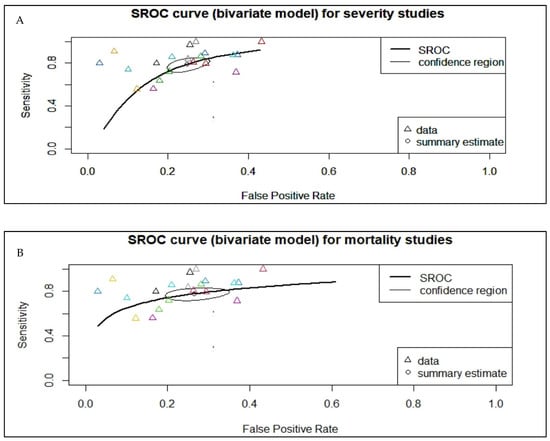 Summary receiver operating characteristic (SROC) curve, which analyzes the pooled area under the curve (AUC) for COVID-19-related outcomes. (A) The pooled AUC for severity studies was 0.833. (B) The pooled AUC for mortality studies was 0.820. The Δ stands for individual study data points while the O stands for summary estimates.