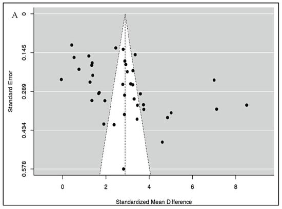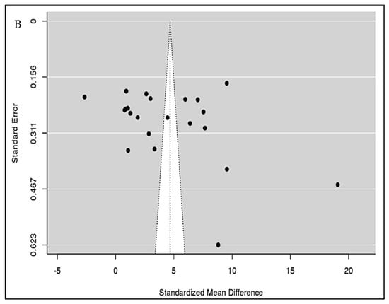 Meta-regression analysis was conducted to ascertain the association between NLR values and severity in COVID-19. These were presented as bubble plots. This analysis showed us that the NLR values of patients were not influenced by age (p = 0.893), cardiovascular diseases (p = 0.259), diabetes mellitus (p = 0.545) or hypertension (p = 0.104). Both the rank correlation and Egger’s regression tests indicated potential funnel plot asymmetry (p = 0.0287 and p = 0.0122, respectively) (Figure 4A). However, the trim and fill test did not impute any studies. Leave-one-out analyses demonstrated limited variations in the pooled estimates (max = 2.944, min = 2.737).
