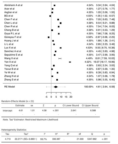 A total of 25 studies consisting of 8351 patients were analyzed in our review. The pooled SMD calculation was conducted using the Der Simonian–Laird random effect models, which observed a value of 4.61 (95% CI: 2.64 to 6.58) between groups with a range from −2.6662 to 19.0655. Even though the Q test showed a high degree of heterogenicity (5347.8816, p < 0.0001, tau2; = 22.2171, I2; = 99.7027%), the 95% prediction interval of the outcomes (ranging from −4.8323 to 14.0613) showed that, although the SMD obtained from the individual studies were generally similar to the pooled SMD estimates, a few studies may have reported a negative true outcome. A study by Yan X et al. [] showed a large studentized residual value (<± 3.0521), making it a potential outlier. Additionally, analysis of Cook’s distances also showed that the same study had the probability of being overly influential. However, the removal of this study from the analysis did not show a significant difference in the pooled SMD values (3.93 (95% CI: 2.35, 5.50)) (Figure 5). There were three studies [,,] with dichotomized NLR values for which we calculated relative risk. The analysis found that there was an increased risk (RR 2.74; 95% CI 0.98–7.66) of mortality in those with raised NLR when compared to those with normal NLR (Figure S8).