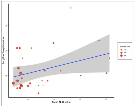 Meta regression analysis presented as bubble plot performed to assess the relationship between the length of hospital stay and NLR value on admission. The blue line indicates the regression line while grey shadow indicate the 95% CI.