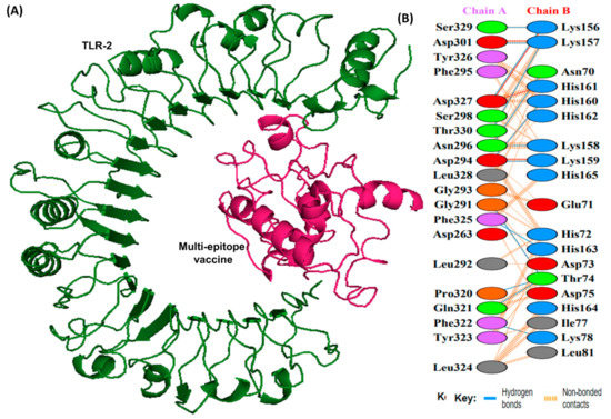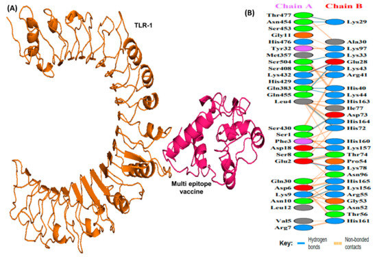 A schematic depicting the docked complex of TLR-1 and vaccine and residue interactions. (A) The TLR-1 receptor is shown in orange and the vaccine (in hot pink) is attached to it. (B) Interface residue interaction. There are 14 hydrogen bonds depicted in blue lines. Residues are shown in multiple colors to show their properties e.g positive (blue); negative (red); neutral (orange); aliphatic (gray); aromatic (purple).