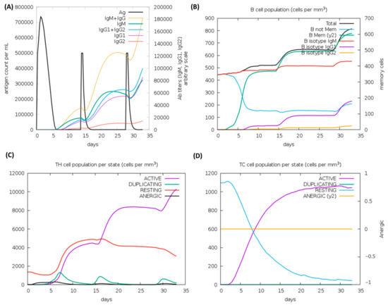 C-ImmSim analysis of a chimeric peptide immune simulation (A) Antibody production after antigen injections (black vertical lines); subclass immunoglobulins are displayed in the form of colored peaks (B) The alterations to B-cell populations following three injections. (C) Changing populations of T-helper cells, and (D) the number of T-cytotoxic cells per state following an injection. T-cells in the resting state are not exposed to antigens, while those in the anergic state are tolerant to antigens due to repeated exposures.