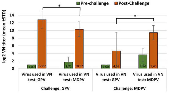 Humoral antibody response to GPV and MDPV in unvaccinated MDA-free ducks, following infection with GPV or MDPV strains at 2 weeks of age. Statistical comparison of post-challenge virus neutralization titers against GPV and MDPV indicate significantly higher titers against the homologous neutralizing virus than against the heterologous one (* in case of GPV infection p = 0.0105; in case of MDPV infection p = 0.0108).