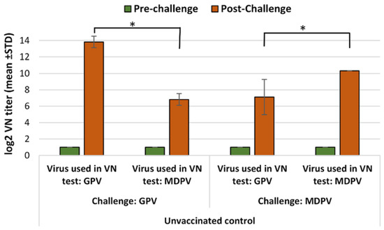 Humoral antibody response to GPV and MDPV in MDA-free ducks, vaccinated with monovalent MDPV vaccine then challenged with GPV or MDPV strains at 2 weeks of age. Statistical comparison of post-challenge virus neutralization titers against GPV and MDPV indicate significant differences in the case of both GPV and MDPV challenge infections (* p = 0.0323 and * p = 0.0218 respectively).