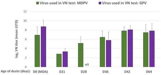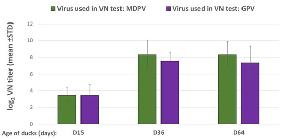 Blood samples were taken of the wing vein from all birds at the time of challenge (15 days of age) and all surviving ducks at the end of the post-challenge observation period (36 days of age). The changes in VN antibody titers to GPV and MDPV following challenge were determined both in the vaccinated and unvaccinated ducks at the end of the observation period (D36) and were compared to the VN titers measured at the time of challenge (D15).