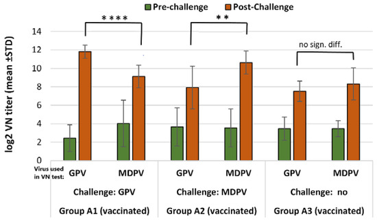 In the non-vaccinated ducks, high VN titers were detected after a challenge with infection either with GPV or MDPV against the homologous viruses, but were much lower against the heterologous ones. The differences were highly significant (Figure 3).