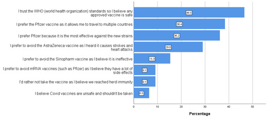 Participants were then asked about what vaccine they would prefer taking from five current vaccines (Pfizer, AstraZeneca, Sputnik V, Johnson and Johnson, and Sinopharm). Additional options were available such as (‘I don’t mind any vaccine’, ‘any vaccine other than Sinopharm’, ‘any vaccine other than mRNA vaccines’, and ‘I prefer no vaccine’). Participants were also asked to choose what factors affect their vaccine choice from a number of factors such as the perceived increased efficacy of the Pfizer vaccine against new strains, trust in WHOs standards, perceived lower efficacy of certain vaccines, harmful side effects of certain vaccines, ease of travel after taking certain vaccines, herd immunity, belief that COVID-19 vaccines are unsafe, and harmful side effects of mRNA vaccines.