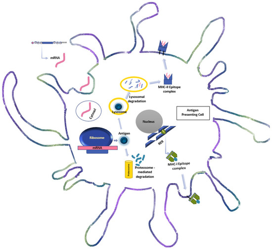 Schematic diagram of intracellular events in mRNA processing by the antigen presenting cells. mRNA enters the cell through the cytosol and translated by the ribosome into the encoded antigen. The antigen is then: (A) degraded into small protein fragments and epitope by the proteosome, which combine with the MHC-I complex at the rough endoplasmic reticulum and traffics to the cell membrane for presentation to naive CD8 (+) cytotoxic T cells; (B) either exocytosed to re-enter the APC through endocytosis or enters the autophagic pathway. Then, the antigen is split into fragments and its epitopes by lysosomal degradation. These epitopes bind with the MHC-II complex and are transferred to the cell membrane to activate naive CD4 (+) T lymphocytes. (MHC: major histocompatibility complex, RER: rough endoplasmic reticulum).