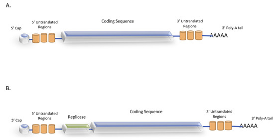 Schematic structure of an mRNA vaccine construct: (A) non-replicating and (B) self-replicating, 5′ cap—all eukaryotic mRNA has a cap that contains an m7GpppN structure, preserved throughout evolution. The cap structure not only prevents degradation, but also assists in binding with the eIF to activate translation. Untranslated regions regulate the translational efficiency, whereas the coding sequence contains codons that encode the gene of interest. The poly-A tail acts to maintain the stability of the RNA molecule [37,38,39,40].