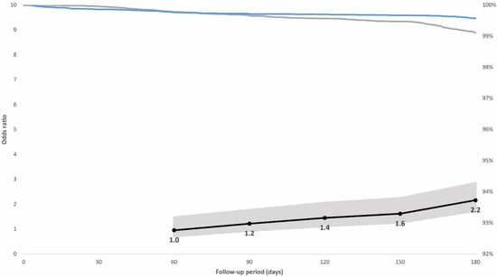Individuals in the case-control population vaccinated in the prioritized first phase. Right vertical axis: distribution of breakthrough infections in the 180-day follow-up period displayed by immunity status at baseline (blue line: hybrid immunity, grey line: vaccination only). Left vertical axis: odds ratios (black line) including 95% confidence intervals (grey-shaded area) for breakthrough infections adjusted for booster dose administration among individuals with vaccination alone compared with individuals with hybrid immunity for post-vaccination days 60, 90, 120, 150, and 180. The initial variants of concern (Alpha and Delta) dominated SARS-CoV-2 circulation during the post-vaccination follow-up period.