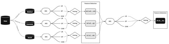 Built upon this idea, we extended the ensemble learning in our feature selection methodology and applied RFE to three classification methods: the LR, the DT, and the SVM. The classifiers, wrapped with RFE, select the most relevant features-eliminating dependent variables, resulting in stronger results and better generalization. Figure 2 depicts the system architecture. The RFE removes attributes recursively and creates a model on those remaining attributes. The model is re-fitted for each step of the elimination process. The attributes are ranked in descending order of importance via eliminating attributes with the minimum contribution. The model accuracy is used to determine which attributes significantly contribute to the target attribute prediction. This process is repeated until a specified number of features remains. The number of features to select in RFE is a hyperparameter that needs to be explored and fine-tuned, as we do not know how many features are essential in our dataset.