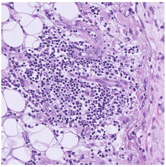 Microscopic view of the pleural specimen. Hematoxylin and eosin-stained pleural tissue by surgical biopsy shows focal lymphocytic infiltration, but without the presence of malignancy, granuloma, or lupus erythematosus cells. Original magnification 20×.