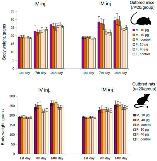 The acute toxicity study in outbred mice and rats with single intravenous and intramuscular vaccine injections demonstrated that a single administration of the vaccine at 10 μg/animal or 40 μg/animal did not lead to mortality, body, or organ weight decrease, or worsening of the overall condition. The determination of lethal doses LD10, LD16, LD50, or LD84 was impossible due to the absence of mortality. It was also shown that the animals steadily gained weight with no lags for the entire period of the study. The average values of the initial body weight and the body weight at the end of the study are depicted in Figure 1. A comparison of six groups (males and females separately) using the Kruskal-Wallis test did not show any significant differences (p > 0.05). The necropsy study, carried out on the 14th day following the vaccine administration, showed no abnormalities in the structure of the internal organs in mice and rats or any pathological changes (data not shown).