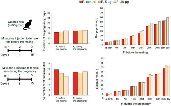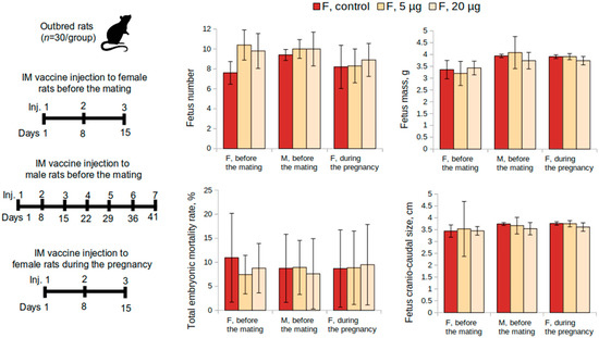 The reproductive toxicity of the vaccine was studied in female (n = 60) and male (n = 30) outbred rats. Female rats were administered the vaccine intramuscularly at a dose of 5 or 20 μg or placebo once a week over a 15-day period before mating with males (3 injections in total, during 3 estrous cycles). A 0.9% sodium chloride solution was used as a placebo. Following the administrations, females were placed together with intact males (2:1) for 10 days (2 estrous cycles) (n = 30 per group, 10 M and 20 F). The overall condition and the behavior of the animals were monitored daily. The body weight of female rats was determined before the start of the study, after the last administration of the vaccine, and the animals were sacrificed on the 20th day of the gestation period. The first possible day of pregnancy was determined by the presence of spermatozoa in vaginal swabs.