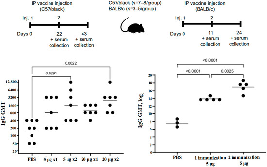 3.2.1. Antibody Titers in the Sera of C57/Black and BALB/c Mice