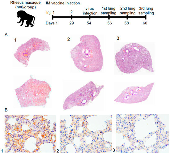 (A) Histotopogram of macaque representative lung samples taken on the 6th day after the infection of rhesus macaques with the SARS-CoV-2; (B) IHC-reaction to S-protein (brown reaction product) in representative lung tissues of rhesus macaque (1—control, 2—5 μg dose, 3—20 μg dose); stained with hematoxylin; magnification 250× (n = 72).