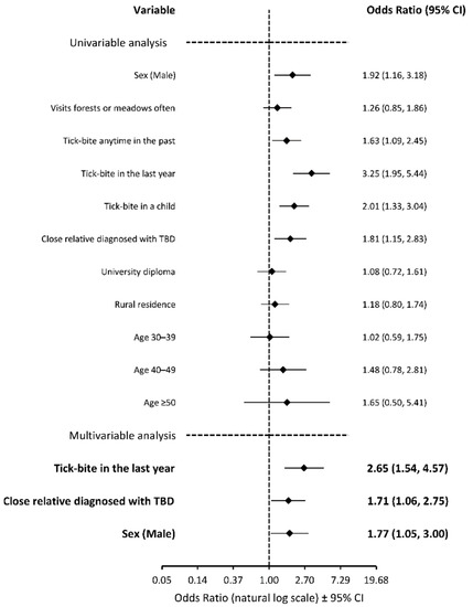 Descriptive data are presented as frequencies and percentages. The attitude towards the TBE vaccine was evaluated using the binary logistic regression model. In univariate analysis we identified variables associated with a positive attitude towards the TBE vaccine (either a past vaccination or a declaration to receive the vaccine). In the multivariate analysis we included variables identified in the univariate analysis with the p-value equal to or below 0.2. A backward stepwise method was used and variables with a significant association were presented in the graphs only. The results of this analysis are shown as odds ratios (OR) and their respective 95% confidence intervals (95% CI). The statistical analysis was performed using TIBCO Software Inc. (2017) Statistica, version 13 (Palo Alto, CA, USA).