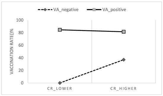 To better understand the interaction effect between CR and COVID-19 VA, we conducted a spotlight analysis to further interpret the effect of CR on COVID-19 vaccine uptake among participants with more positive (one standard deviation above mean) and more negative (one standard deviation below mean) COVID-19 VA. As shown in Figure 2, CR was moderated by COVID-19 VA, and it was more effective among individuals who had more negative COVID-19 VA. It further illustrates that the CR–COVID-19 vaccine uptake relationship was stronger among participants who had a more negative COVID-19 VA.