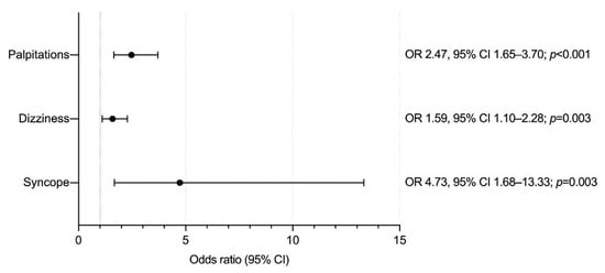 The most common psychological/psychiatric symptoms were anxiety in 129 (67.5%) patients; panic attacks in 30 (15.7%); insomnia in 25 (13%); and agitation in 11 (5.7%). Their main characteristics are described in Table 3. HCWs reported psychological/psychiatric symptoms (n = 110; 57.6% vs. n = 81; 42.4%). Other lower-frequency symptoms were fear (n = 2) and sadness (n = 3). After adjusting for confounding factors by multivariable analysis, the odds for reporting psychological/psychiatric symptoms were significantly higher for those reporting syncope (OR: 4.73, 95% CI: 1.68–13.33); palpitations/racing heart (OR: 2.47, 95% CI: 1.65–3.70); and dizziness (OR: 1.59, 95% CI: 1.10–2.28) (Figure 1). None of the other included variables were associated with developing psychological/psychiatric symptoms.