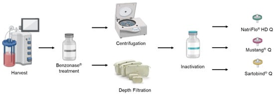 Benzonase® (Sigma, St. Louis, MO, USA) was added to the bioreactor at 10 units/mL and incubated for 1 h before the clarification step. Depth filtration was evaluated as an alternative to the commonly used centrifugation as a cell removing step. From each harvest, 1 L of the harvested material after Benzonase® treatment was centrifuged at 4000× g for 10 min and another 1 L was filtered through MilliStack D0HC® (Millipore, Rockville, MD, USA) depth filter at 7.66 mL/min in sterile conditions as previously described [,]. Before filtration, the depth filter was equilibrated with the filter buffer (50 mM HEPES, 300 mM NaCl at pH 7.2). The clarified material was supplemented with HEPES (Sigma, St. Louis, MO, USA) to a final concentration of 70 mM to maintain the pH at 7.2 during the inactivation. The material was inactivated by adding 0.1% (v/v) β-propiolactone (Sigma, St. Louis, MO, USA) and then stirred for 24 h at 4 °C. The inactivated supernatant was frozen at −80 °C and was thawed upon loading to the AKTATM Avant 25 system (Cytiva, Marlborough, MA, USA) for evaluation of the ion exchange chromatography membranes.